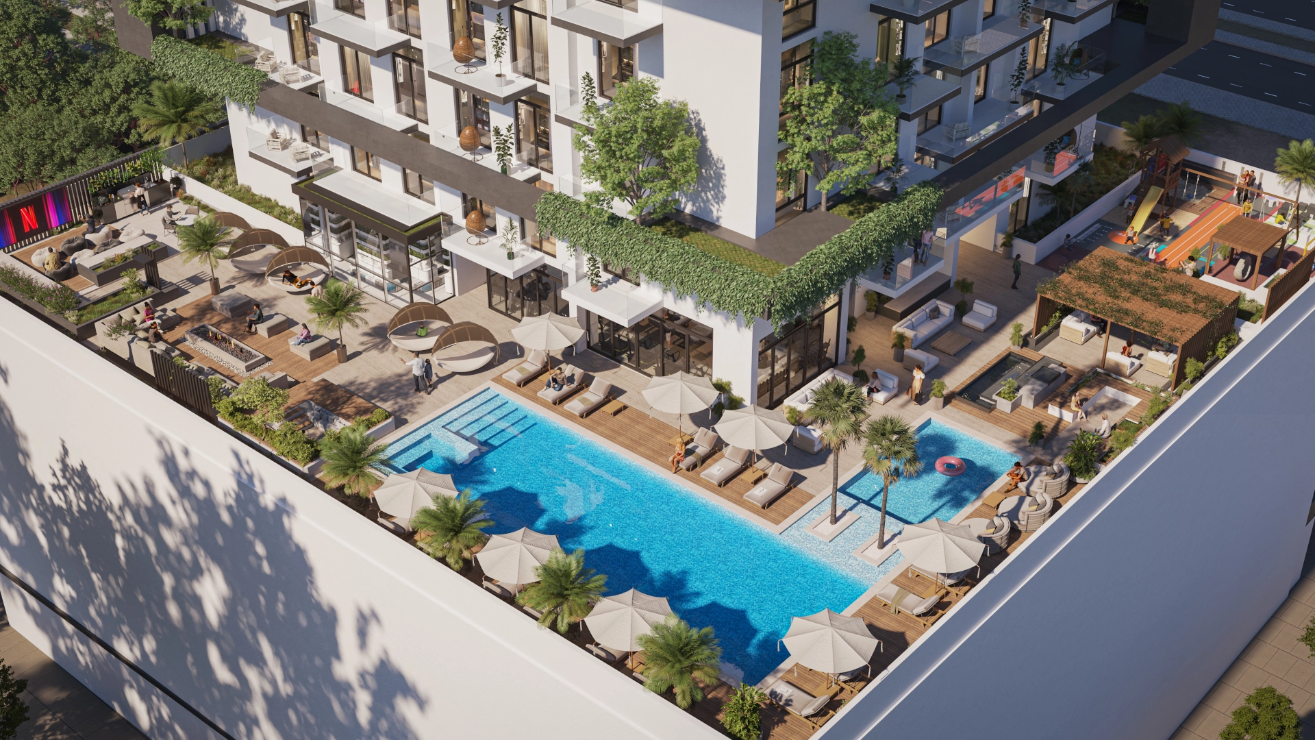 The rectangular adults’ swimming pool is the centrepiece of the amenities offered at this level. The blue tomes of the pool contrast dramatically with the natural tomes of the wooden deck surrounding it, as well as the recliner sunbeds and their umbrellas.