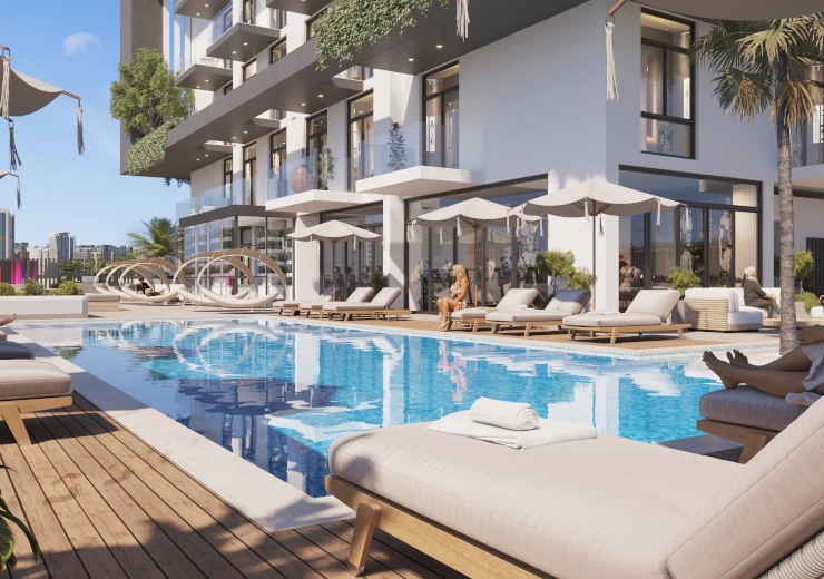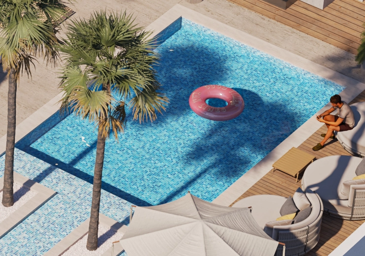 The kids’ swimming pool is adjoined perpendicularly to one end of the main swimming pool, with the two pools being demarcated by two majestic palm trees. The kids’ pool is conveniently located next to some of the outdoor seating and the kids’ play.
