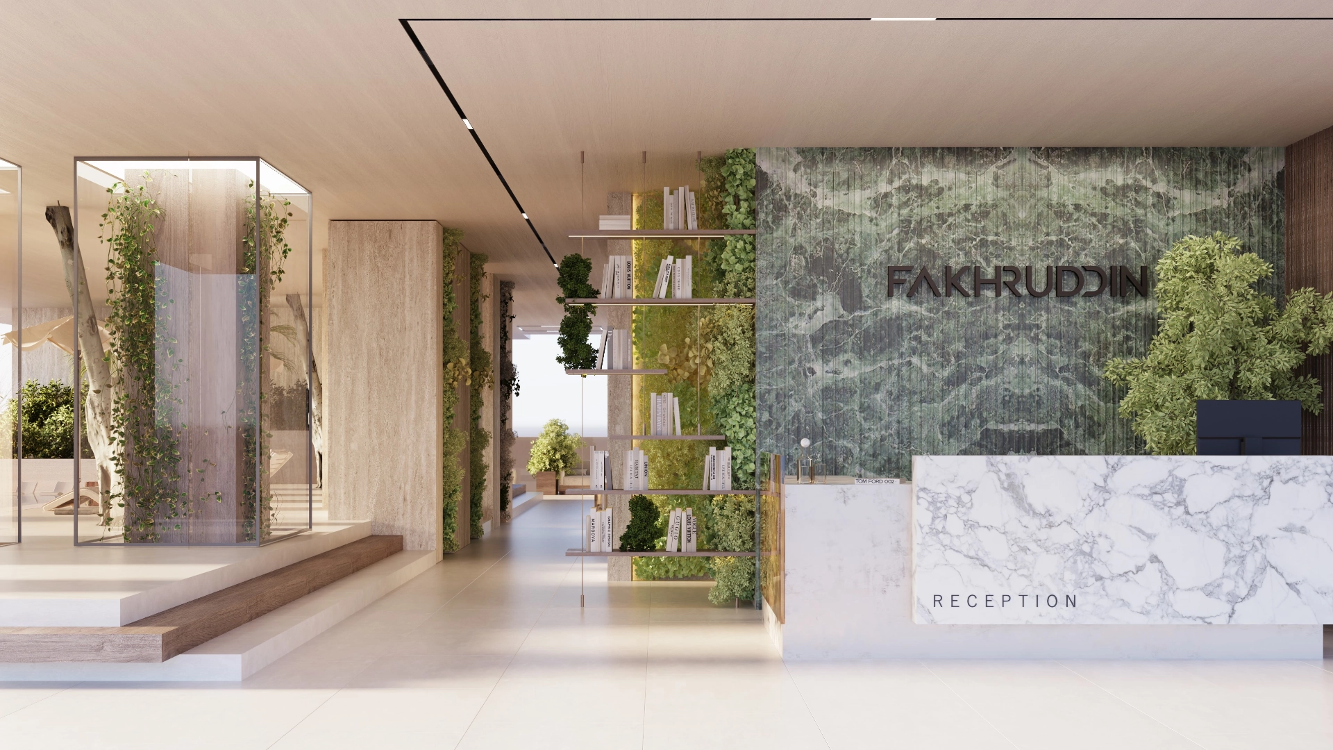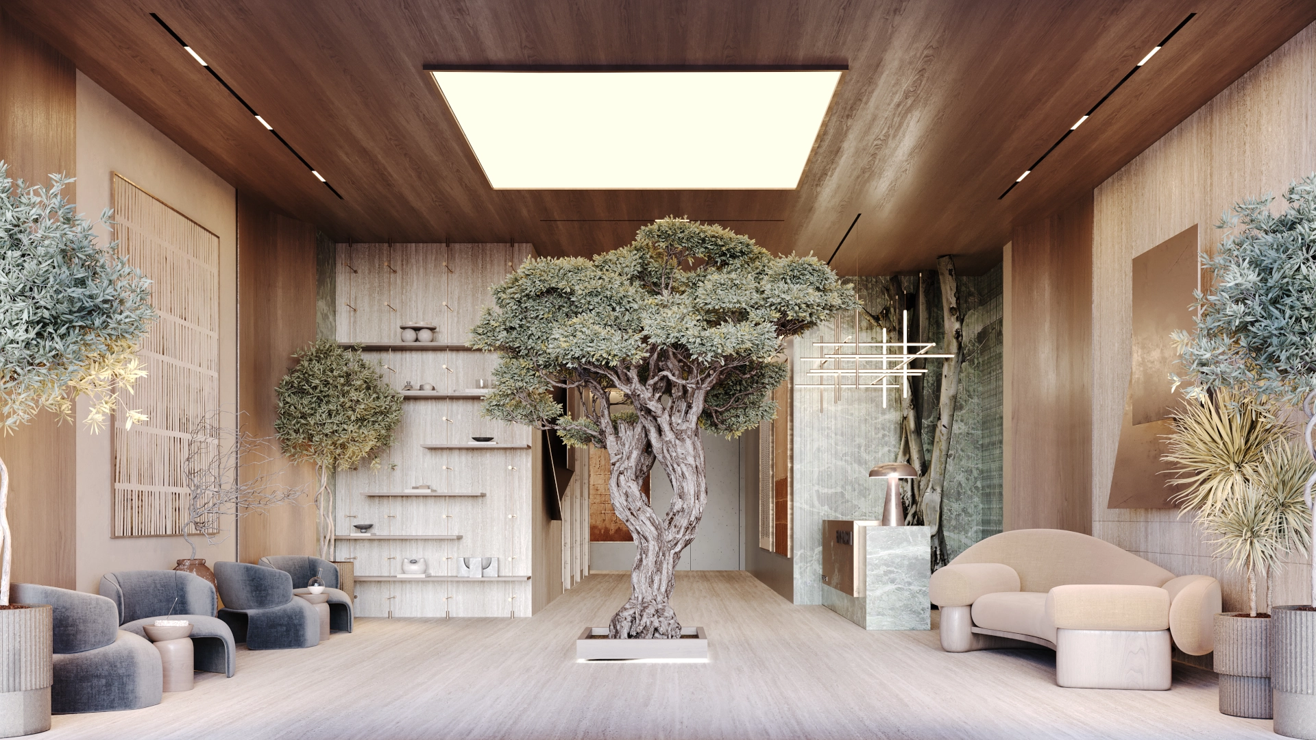 Treppan Tower’s lobby is a welcoming sanctuary that perfectly balances elegance with serenity. The space is naturally ventilated, resulting in a pleasant ambient atmosphere. At its centre is a towering olive tree that transforms the lobby into a green oasis.